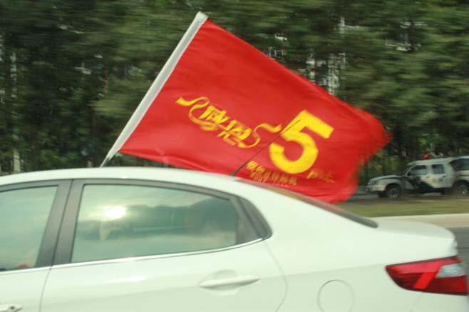 我們總經理的車子使在前方,“高臻智能感恩五周年”的旗子高掛。