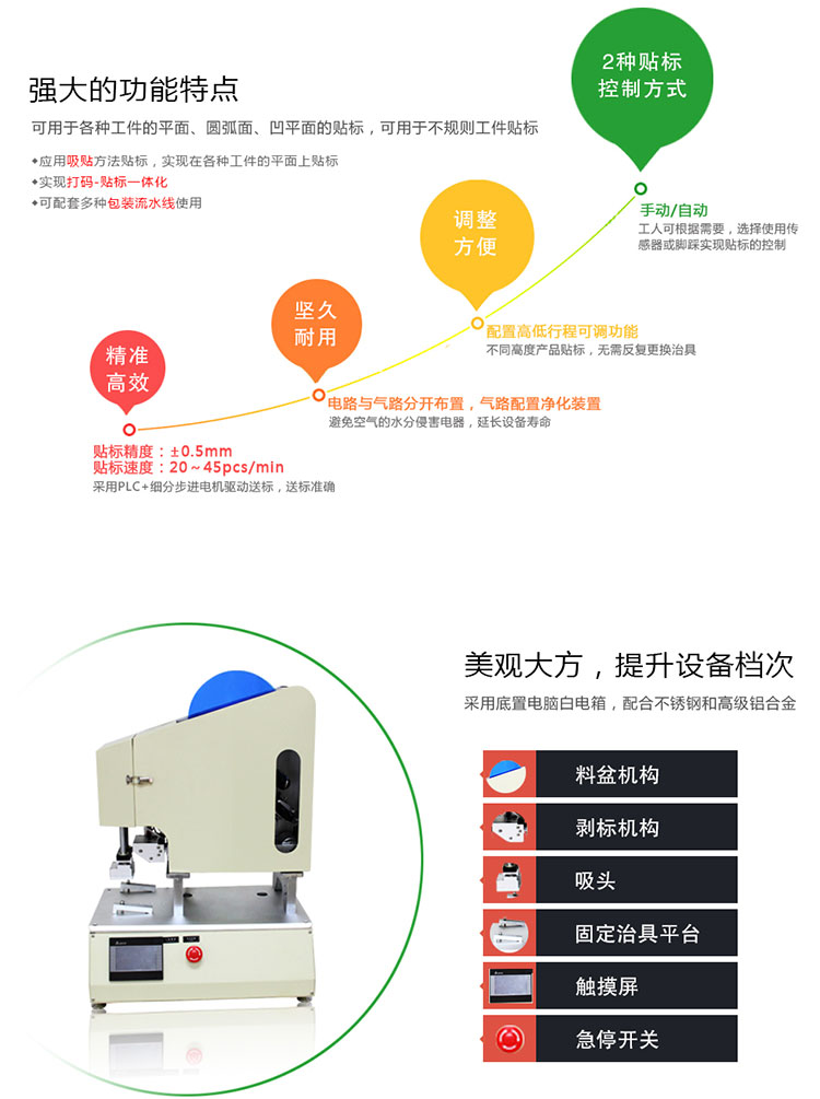 半自動(dòng)高精度平面貼標(biāo)機(jī)有著以下產(chǎn)品特點(diǎn):