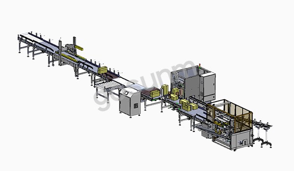 自動開箱→自動90度翻轉→自動側推裝箱→自動90度翻轉正→自動掃描→自動實時打印貼標→自動折蓋封箱→自動貼上下防拆標→自動碼垛→完成。