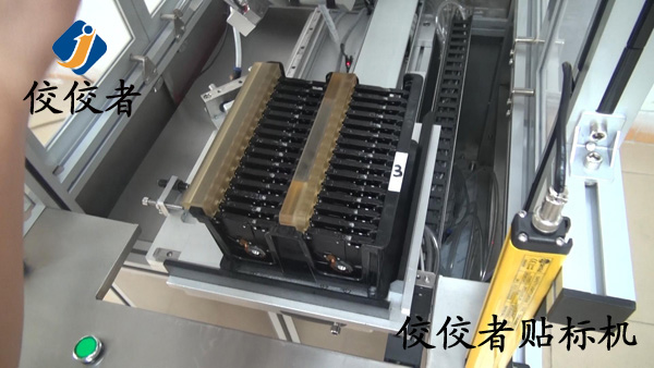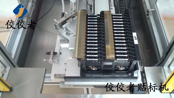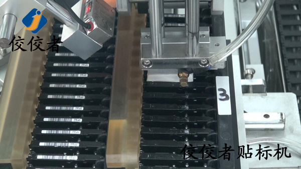 上圖展示的是硬盤貼標機已經(jīng)將硬盤放入治具中并移動到治具臺準備貼標,下一步就是貼標了,如下圖: