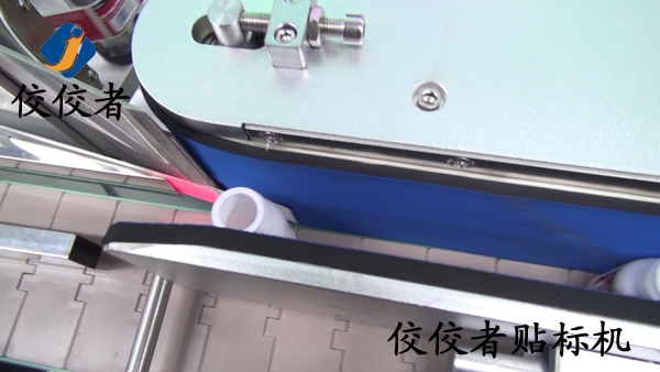 (上圖)接著展示的是剝離的標簽正好貼在輸送中的小圓瓶上,同時即將經過一端正在運行的覆標海棉通道,覆標完成貼標過程看似只有一秒鐘的時間,在這個時間中,機器進行了一系列的工作:測物電眼檢測到小圓瓶時,回饋一個信號給PLC,PLC再發出出標信號,標簽繼續剝離時貼在經過的小圓瓶上,小圓瓶再經過覆標機構.至此,貼標過程就已經完成了. (操作過程:放產品—>分瓶(設備自動實現)—>貼標并覆標(設備自動實現)—>貼標完成。)下圖是貼好標簽的產品: